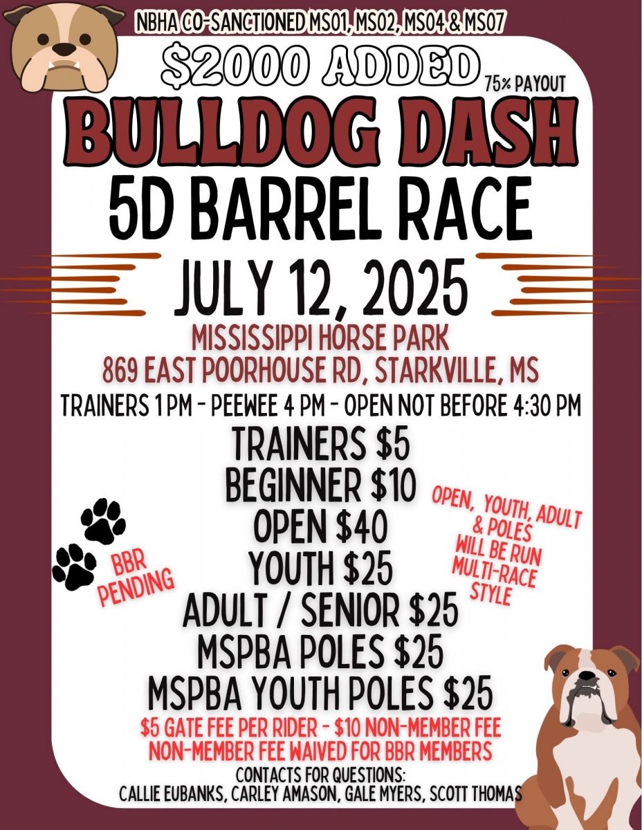 Bulldog Dash 5D NBHA Barrel Race Date: Saturday, July 12, 2025Description: The Bulldog Dash 5D Barrel Race will be July 12.